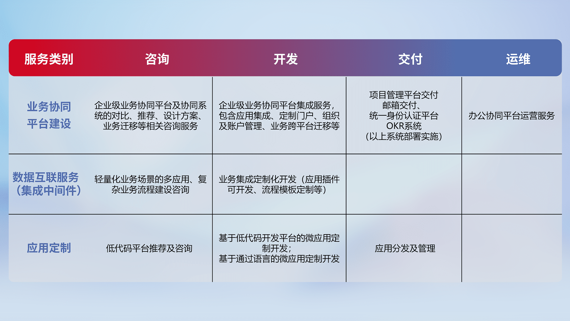 针对钉钉、、企微、、IDaas等平台级产品提供产品的规划、、方案、、交付、、、定制化开发等服务,,实现如统一协同办公、、智能客户服务、、、、混合会议管理、、智能数据查询、、、、等业务场景,,,,实现数字化转型。。