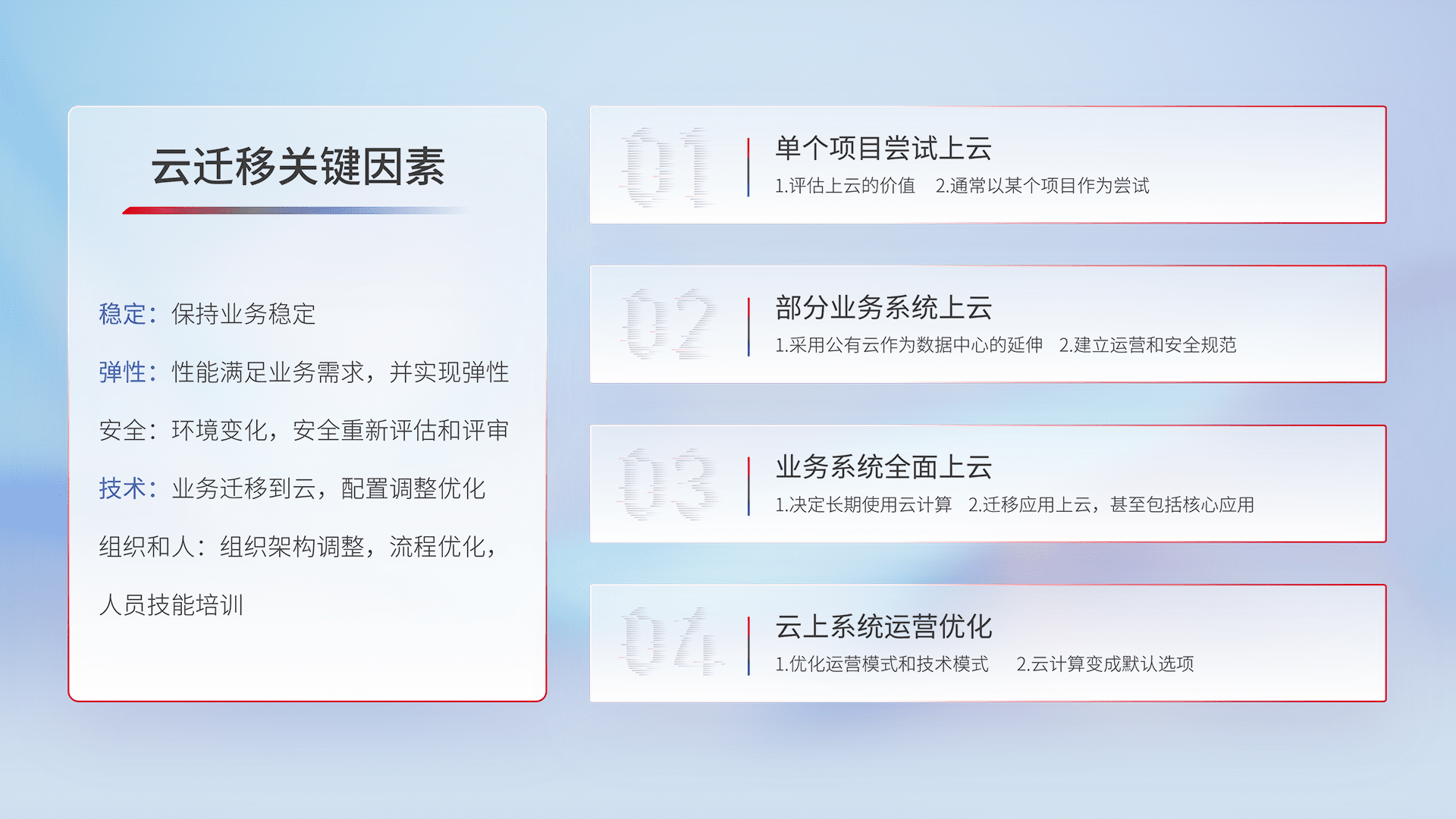结合实际业务,,从规划设计、、云平台选型、、、、云原生改造、、、数据迁移、、集成交付,,,迁移全过程为客户识别最佳上云路径,,,,做好风险识别管理,,,设计网络架构、、、身份权限、、、、安全审计合规、、、、操作审计、、日志审计、、监控告警策略、、多站点容灾设计等,,,对云上基础设施进行整体规划,,,,提升IT治理水平,,以满足弹性、、、高可用、、、高性能的需求。。。