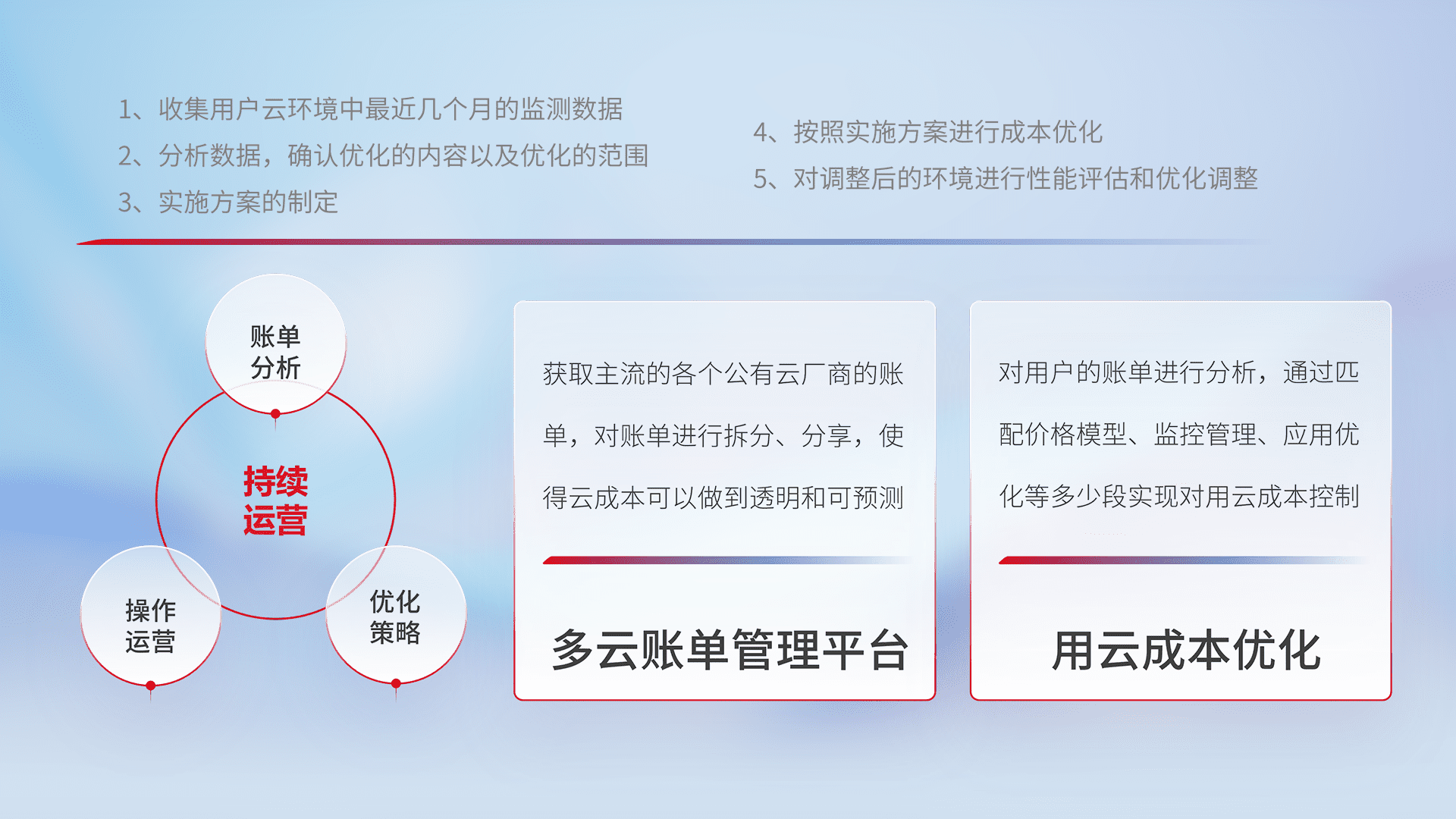 通过多云纳管,,以统一的资源数据模型把客户的云资源进行抽象和封装,,进而实现对多云资源的统一操作,,保障云资源管理的可靠性、、、稳定性与可用性。。。量身定制化运维内容,,,,配置、、开发运维、、补丁管理、、备份、、监控、、认证和访问管理、、、审计和日常巡检等,,保障在用云过程中的可靠度,,稳定度以及高可用率。。。。